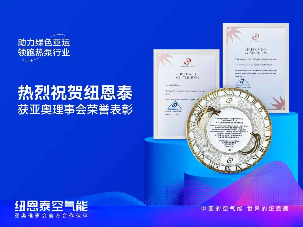 空气能热水供暖系统头部品牌纽恩泰空气能荣获亚奥理事会荣誉表彰