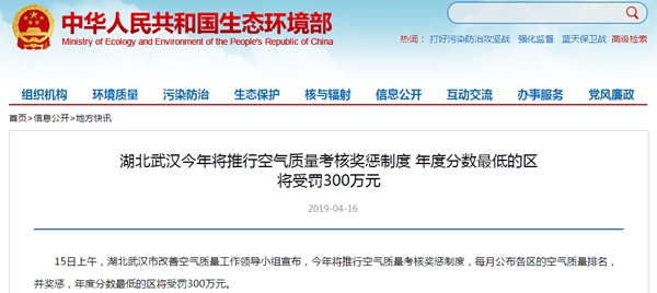 打赢蓝天保卫战,正在全国各地轰轰烈烈上演。近日,湖北武汉市为了改善空气质量,宣布今年将推行空气质量奖惩制度,每月公布各区的空气质量排名,并奖惩。由武汉市财政局负责根据年度考核排名,对排名前3名和后3名的区落实奖惩——第1名奖励300万元,第2名奖励200万元,第3名奖励100万元;倒数第1名罚300万元,倒数第2名罚200万元,倒数第3名罚100万元。