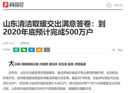 近日,山东清洁取暖前线传来好消息,在省住房城乡建设厅等有关部门的努力下,截至2019年底,山东全省农村地区共完成293.8万户;2020年计划农村地区新增214.46万户。预计到2020年11月15日供暖季正式开始之前,山东农村地区将超过500万户实现清洁取暖,保障群众温暖过冬。
