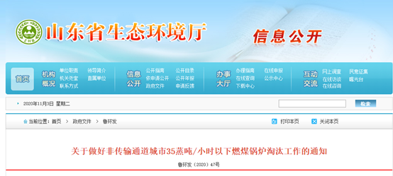 为进一步优化调整能源结构,深入推进大气污染防治工作,持续改善环境空气质量,近日山东七部委下发通知,要求青岛、枣庄、东营、烟台、潍坊、泰安、威海、日照、临沂9个非传输通道城市,到2021年10月底前,淘汰所有35蒸吨/小时以下燃煤锅炉(高效煤粉炉除外)。全省不再新建35蒸吨/小时以下各种类型燃煤锅炉。