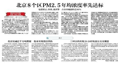 “十三五”时期是迄今为止北京市大气污染治理力度最大,成效最明显的五年。2020年,全市PM2.5年均浓度为38微克/立方米,较2015年下降42.6微克/立方米,在京津冀及周边地区“2+26”城市中保持最优,超额完成“十三五”规划目标任务。其中,密云、怀柔、延庆、门头沟、平谷、昌平、房山、顺义等8个区率先实现达标,占全市域面积的近80%。