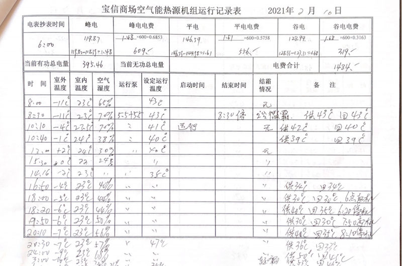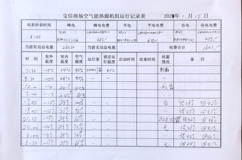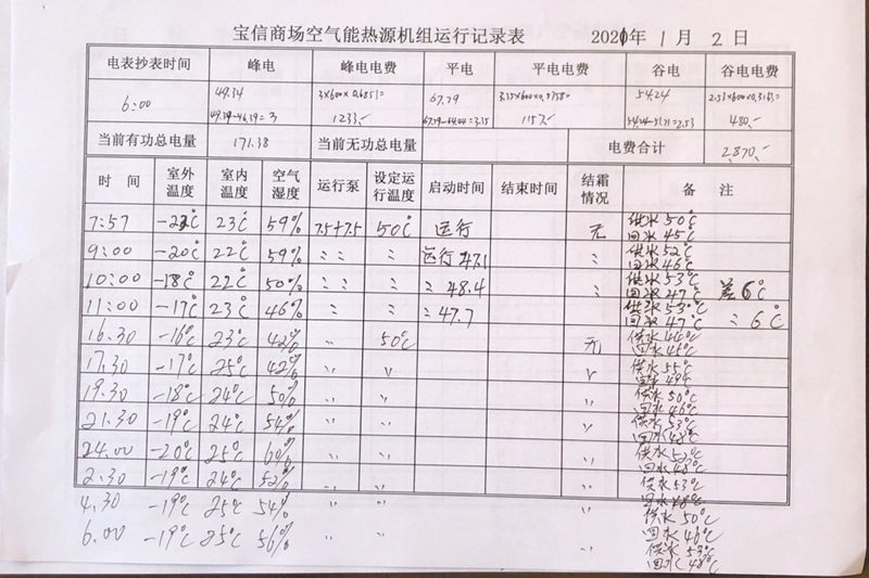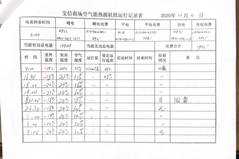 当地实行峰谷电价,历年市政供暖费用约为35元/平米,宝信商场楼层较高,每层均加收超高部分费用,2016-2019年未采用纽恩泰空气能热泵之前,采暖费用约50元/平米,6000平米供暖面积,每个采暖季需支出约30万元。2020年安装纽恩泰GKD系列超低温热泵后,采暖费用为23.71元/平米,约为原来集中供暖的二分之一,采暖电费大幅降低,为商场节省经营成本。