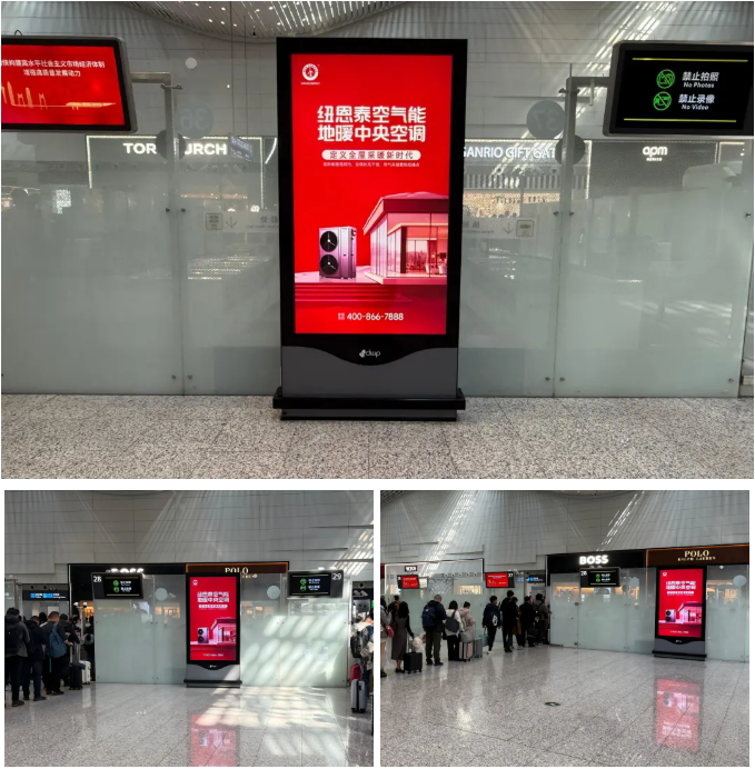 纽恩泰自2024年入驻T1航站楼、设立纽恩泰空气能品牌展示馆以来,持续向国内外旅客展示空气能技术和产品。2026年开年,纽恩泰再度加码,在T2航站楼核心动线投放品牌广告。通过“长期展示+高频曝光”的组合,提升纽恩泰在国内外市场的知名度和影响力。