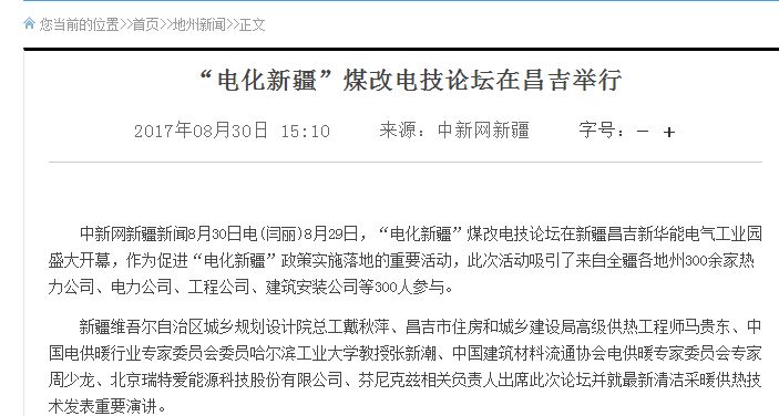 8月30日电(闫丽)8月29日,“电化新疆”煤改电技论坛在新疆昌吉新华能电气工业园盛大开幕,作为促进“电化新疆”政策实施落地的重要活动,此次活动吸引了来自全疆各地州300余家热力公司、电力公司、工程公司、建筑安装公司等300人参与。