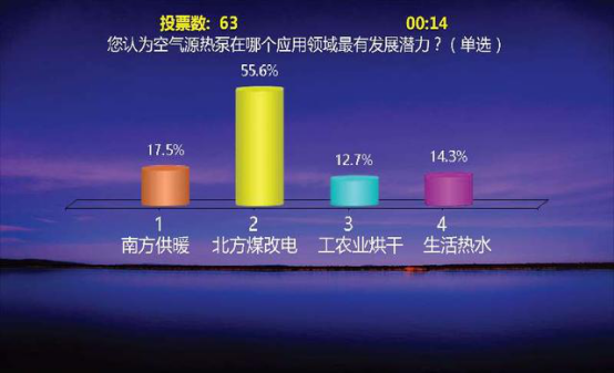 近日,“2017中国暖通空调产业发展年会”召开,在年会上,主办方就进行了一场投票。投票的主题正好就是“空气能热泵在哪个领域最有发展潜力”,现场与会的人不少,大家经过深思熟虑后都投出了自己手中宝贵的票,其中有一半人将自己的票投给了“北方煤改电”。最终结果,“煤改电”以55.6%的投票占比赢得第一,南方供暖、生活热水以及工农业烘干分列二、三、四位。