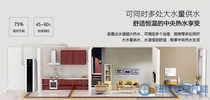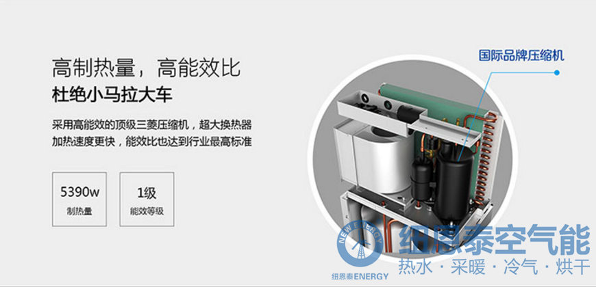 空气能热水器在民间的盛行,在于它那不同于传统热水器的优势:一是节能,二是安全。以纽恩泰的“锋尚一体机”为例,它采用进口的顶级三菱压缩机,配合超大换热器,在制热能效上远远超越同类热水器,制热量可达5390w,制热能效等级为1级,制热能效比COP可以达到4.0,是电热水器的四倍。因此,可以比电热水器节能75%。