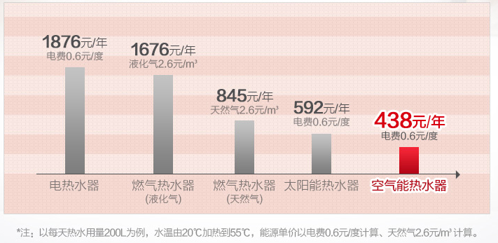 相关机构统计出的数据给出了这样的结果:每天制取200L热水,水温从20℃提升至55℃,电费按照民用电价0.6元/度计算,电热水器的费用要超过1500元,而空气能热水器的制热费用仅为500元不到。因此,使用空气能热水器一年,可以节省上千元的电费,效果显著。