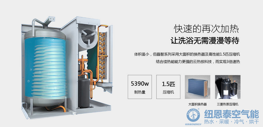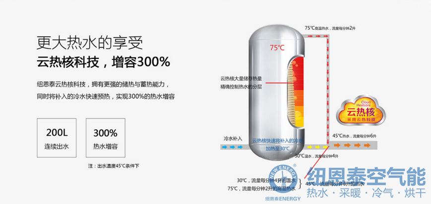 除了空气能热水器本身硬件的差别之外,不同企业对加热过程也有截然不同的理解。以纽恩泰为例,纽恩泰的“晶智·空间A型”空气能热水器,应用了纽恩泰研发的“云热核”技术,对内胆进行了改造,做分层处理,让空气能热水器热水增容300%,连续热水出水量达到200L,在同一时间内实现更多出水。