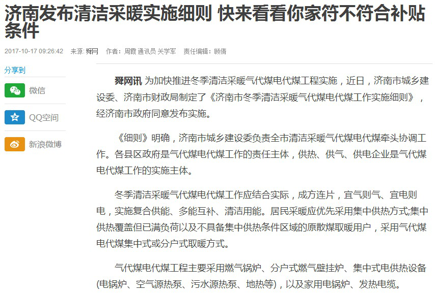 济南出台清洁采暖实施细则:空气能热泵再次进入近日