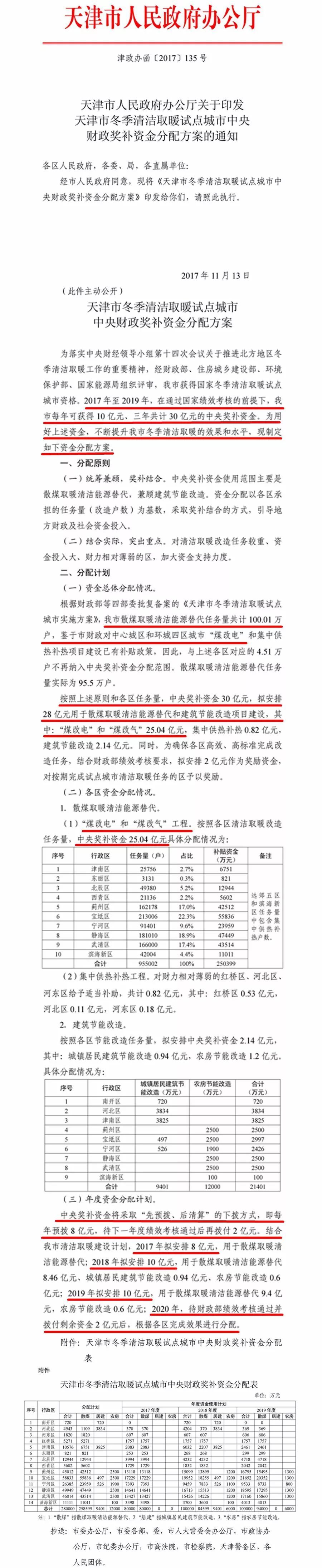 日前,天津市人民政府办公厅还印发了《天津市冬季清洁取暖试点城市中央财政奖补资金分配方案》,指出2017年至2019年,在通过国家绩效考核的前提下,天津市每年可获得10亿元、三年共计30亿元的中央奖补资金。