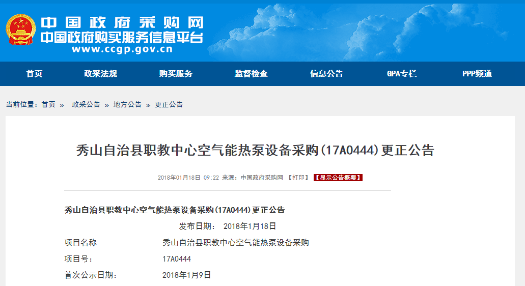 秀山自治县职教中心空气能热泵设备采购(17A0444)更正公告