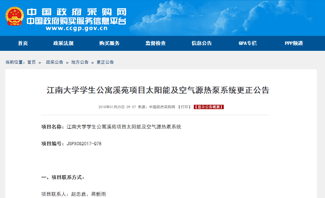 原公告项目名称:江南大学学生公寓溪苑项目太阳能及空气源热泵系统