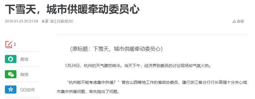 1月24日,浙江省杭州市,经济界别委员的讨论现场气氛火热。曾在山西等地工作的省政协委员、建行浙江省分行行长高强针对低温天气提出了一个问题,杭州是否能集中供暖。他认为:单独供暖一是价格高,二是各家各户单独铺设设施,也会在城市规划上出现一些问题。而集中供暖则有助于提高老百姓的生活品质。