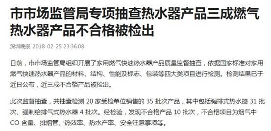 近日,深圳市市场监管局依据国家标准(材料、结构、性能及标志、包装等四大类项目),对目前市场上销售的家用燃气快速热水器产品进行检测。检测结果显示,目前市面上销售的家用燃气快速热水器产品有近三成不合格。