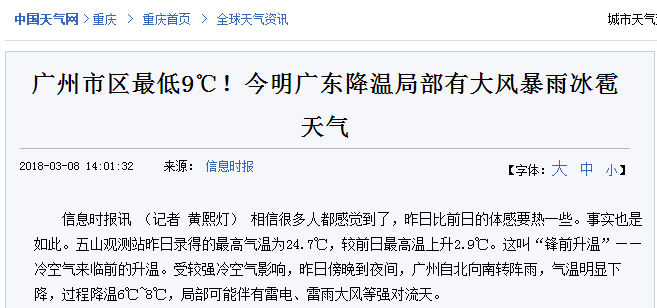 近日,一场寒流袭击我国的广东地区。广东多个市、县都出现了大幅的降温,温降达到6~8℃。广东市区的最低温度更是低至9℃!除此之外,还可能出现大风和雷雨。堪称是忽如一夜冬风来。