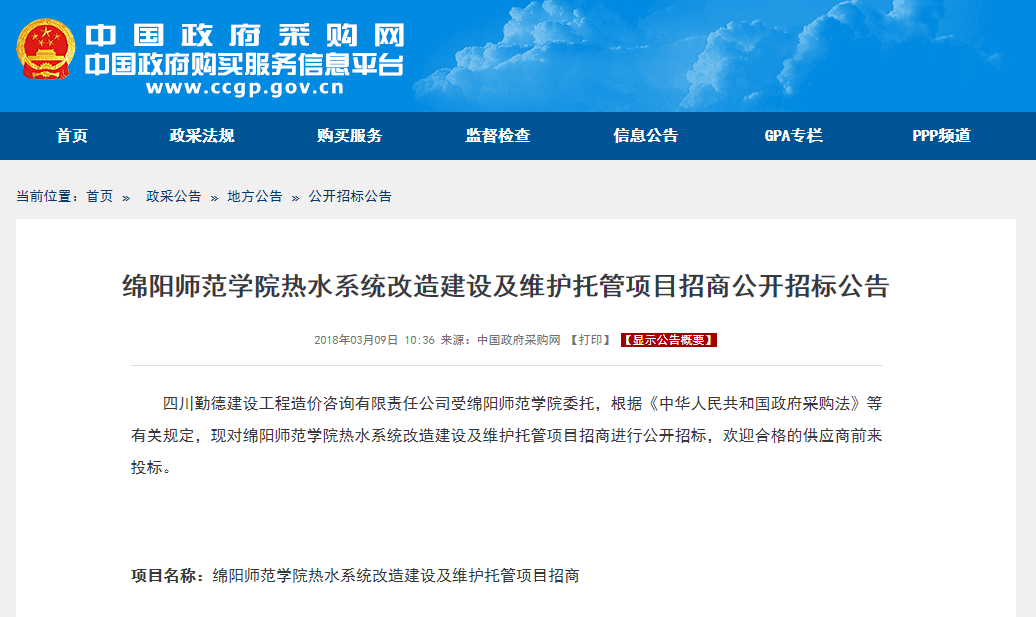 绵阳热水系统改造建设及维护托管项目招商公开招标公告