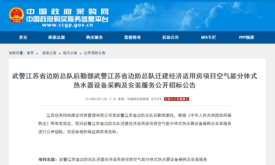 江苏省边防总队空气能分体式热水器公开招标公告