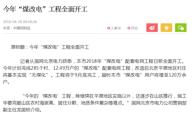 小编近日从国网北京电力获悉,北京市2018年“煤改电”配套电网工程日前全面开工。今年计划完成285个村、12.49万户的“煤改电”配套电网工程,改造后北京平原地区村庄将基本实现“无煤化”。工程将于9月底完工,届时本市“煤改电”用户将增至120万余户。