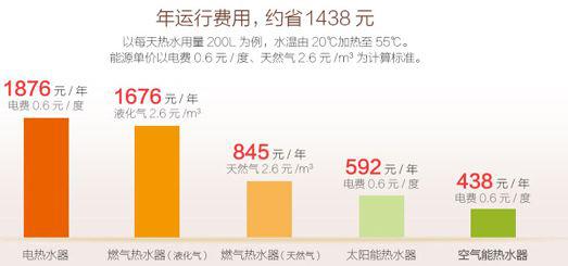 从图中可以看到,空气能热水器由于制热效率最高,一年下来电费开支大约为440元。而电热水器则需要1500元以上的开销。鲜明的数字对比,无疑证明了空气能热水器的节能并非“浪得虚名。”